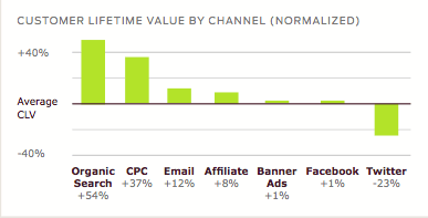 Facebook was a paltry 1% above average when it came to CLV for e-commerce retailers, which was in a dead heat with banner ads, while Twitter tanked with a -23% below average CLV score.